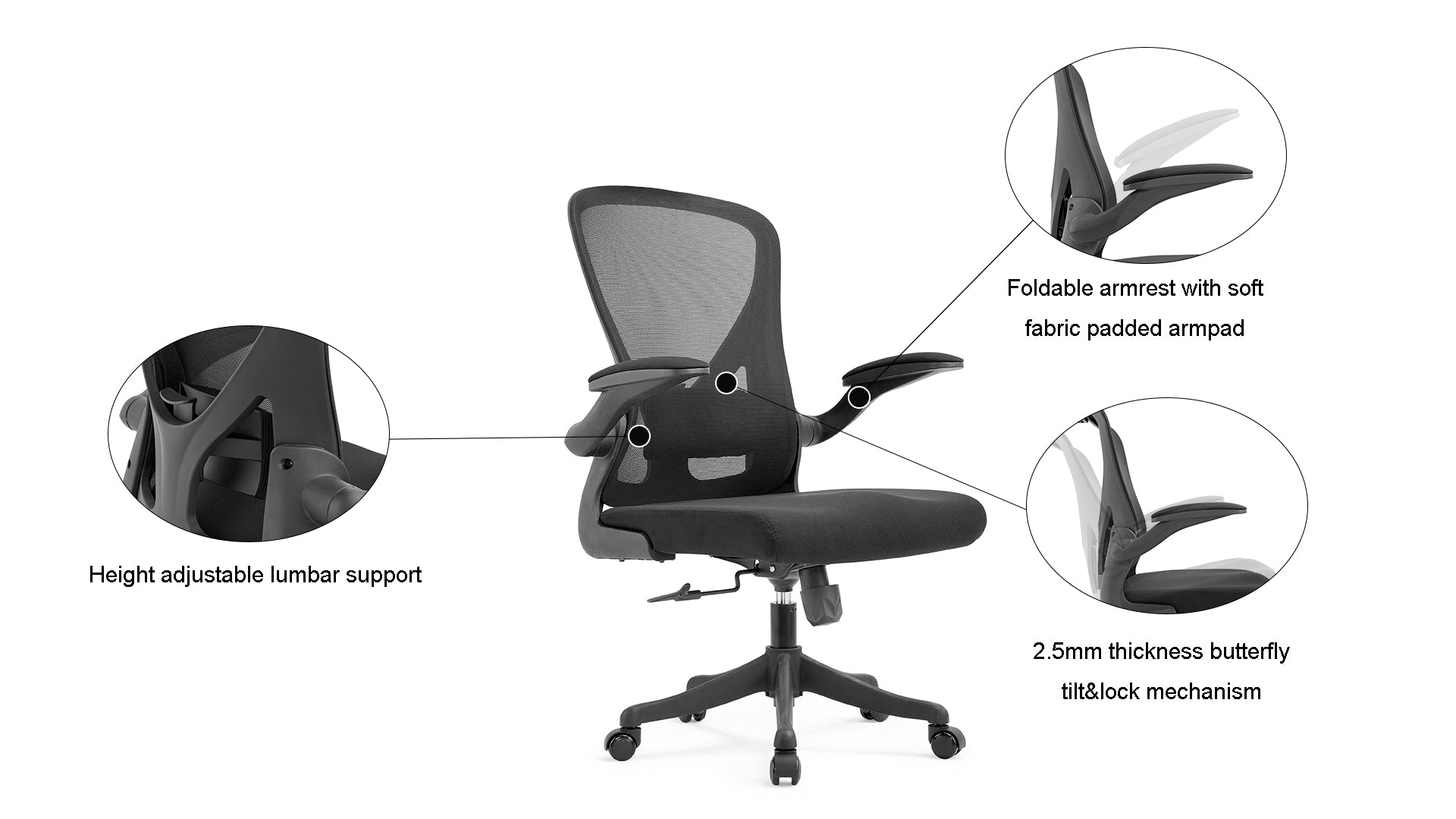 2) Mesh back + black PP with fiber back frame (Back strength test more than 136kgs) + height adjustable lumbar support