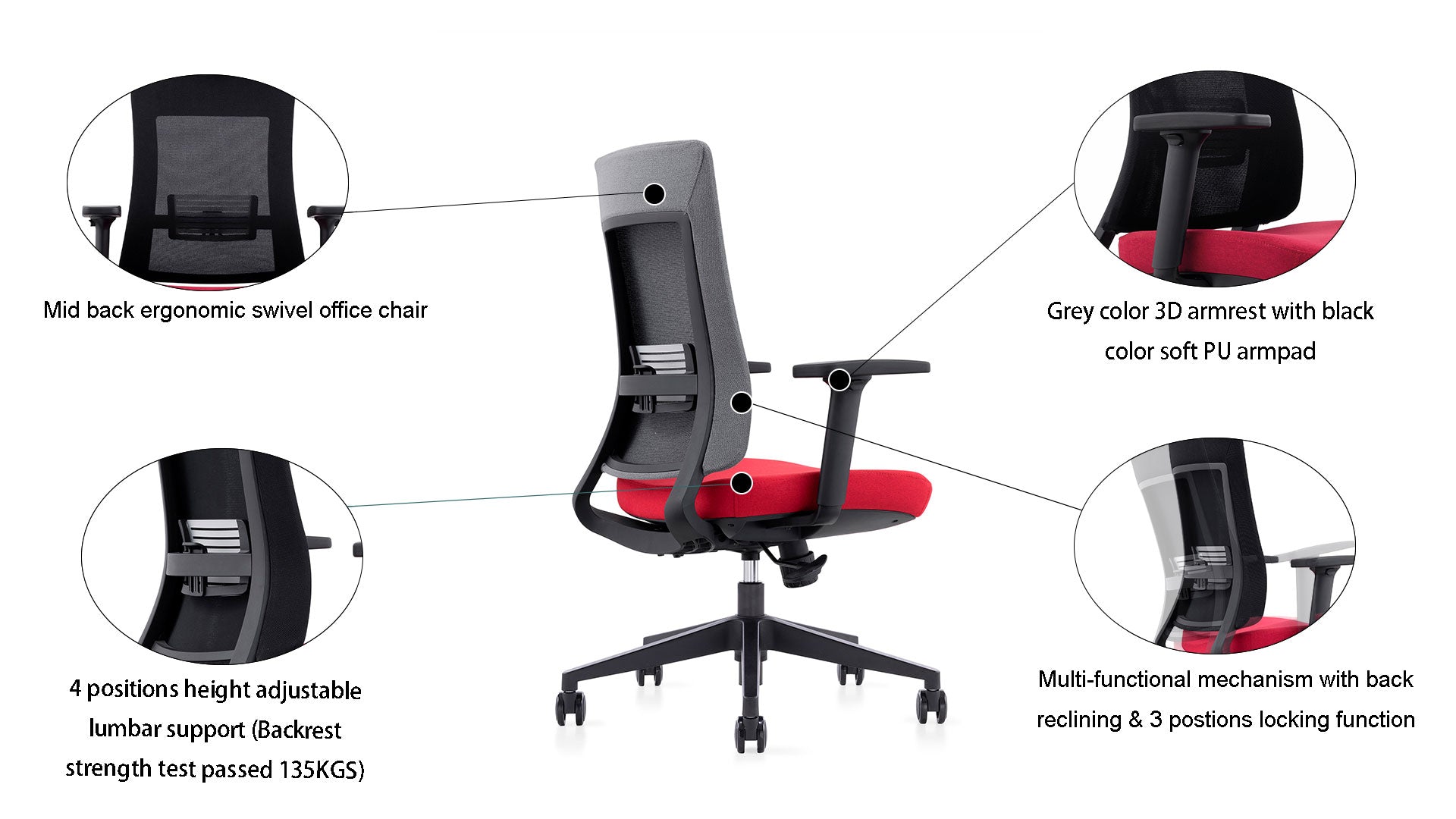 2) Black color PP with fiber back frame with patent + 4 positions height adjustable lumbar support (Backrest strength test passed 135KGS)