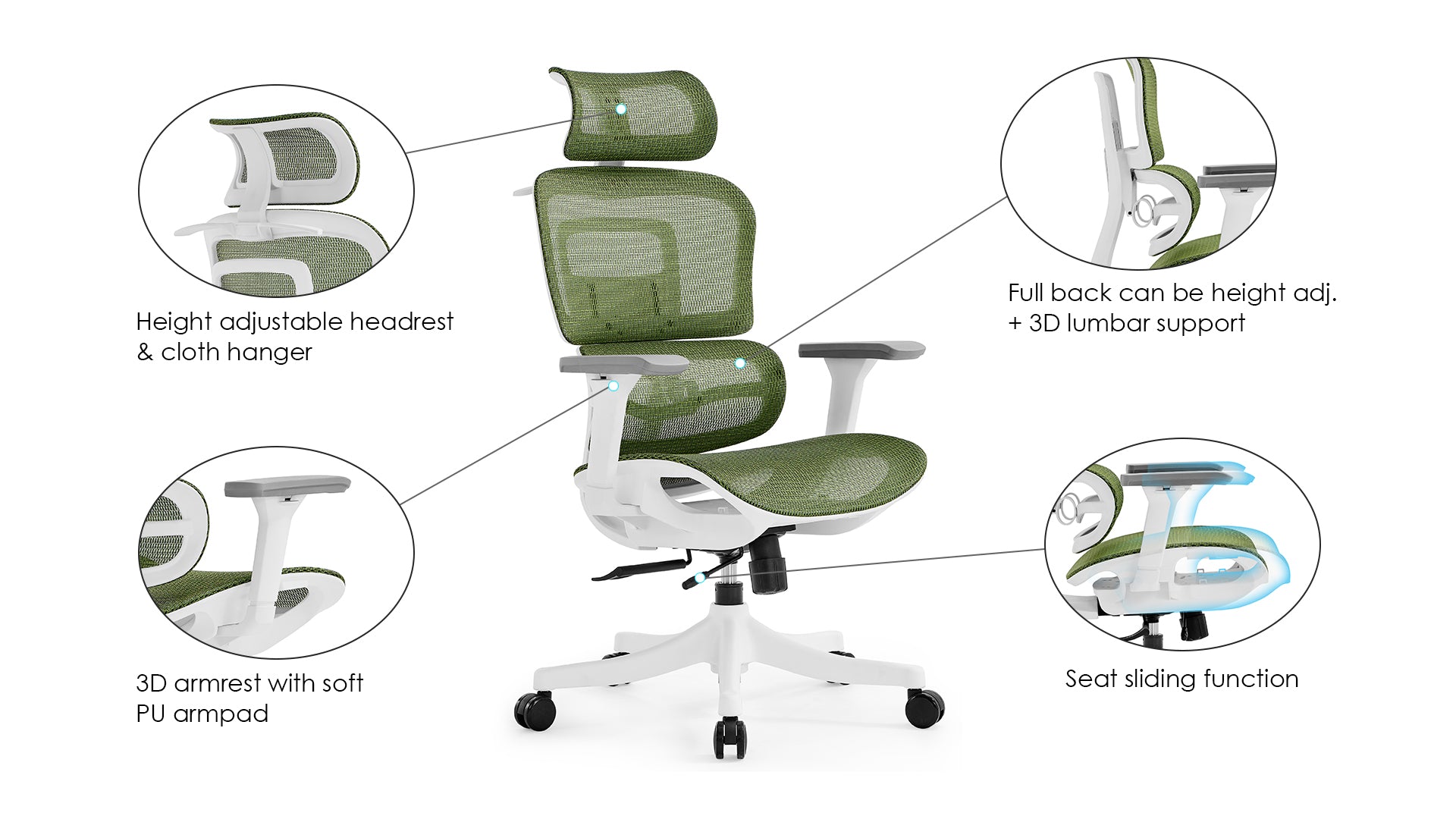 2) Full nylon mesh back & seat + white nylon back frame + height adjustable headrest & cloth hanger