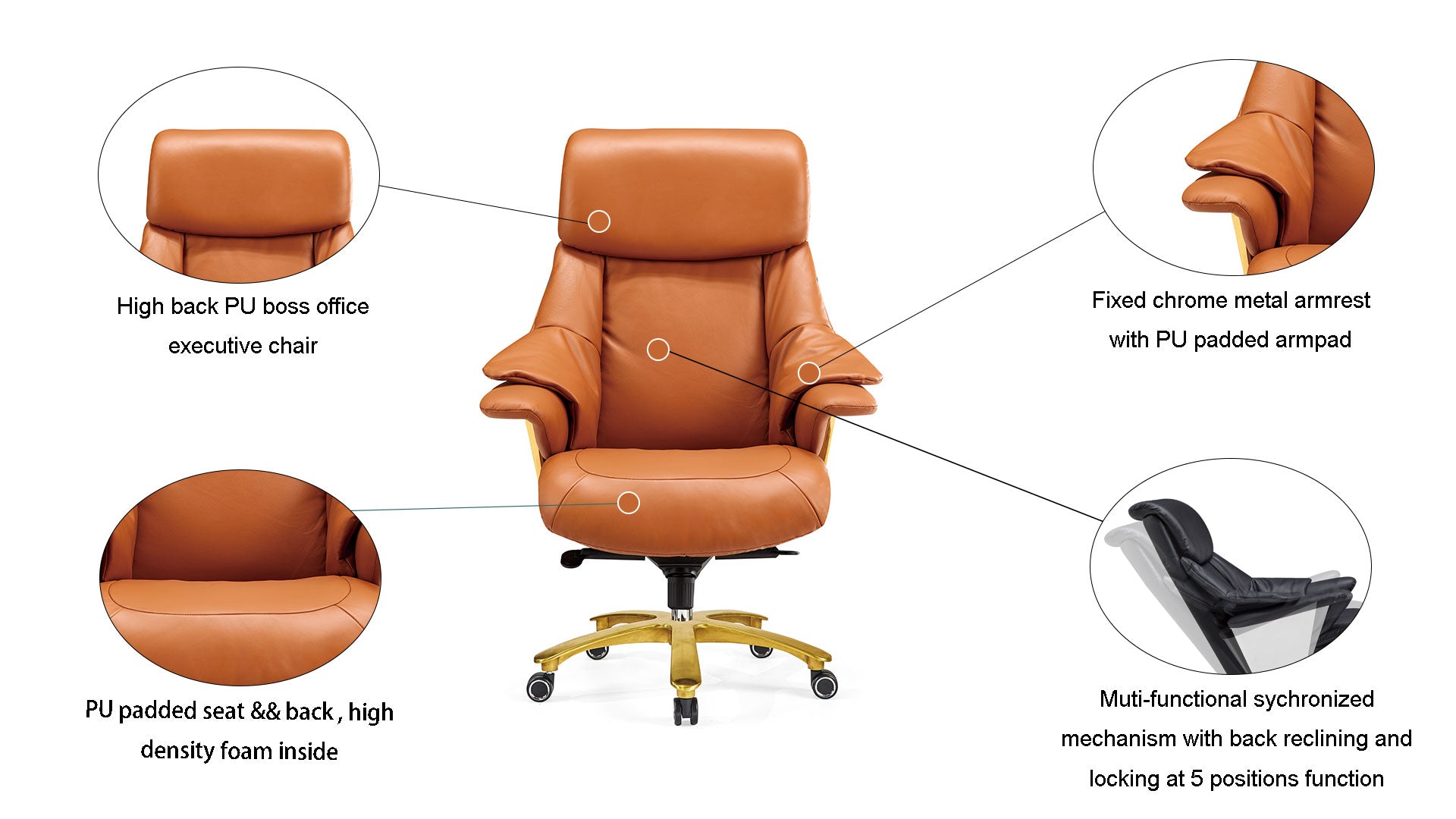 3)Muti-functional sychronized mechanism with back reclining and locking at 5 positions function